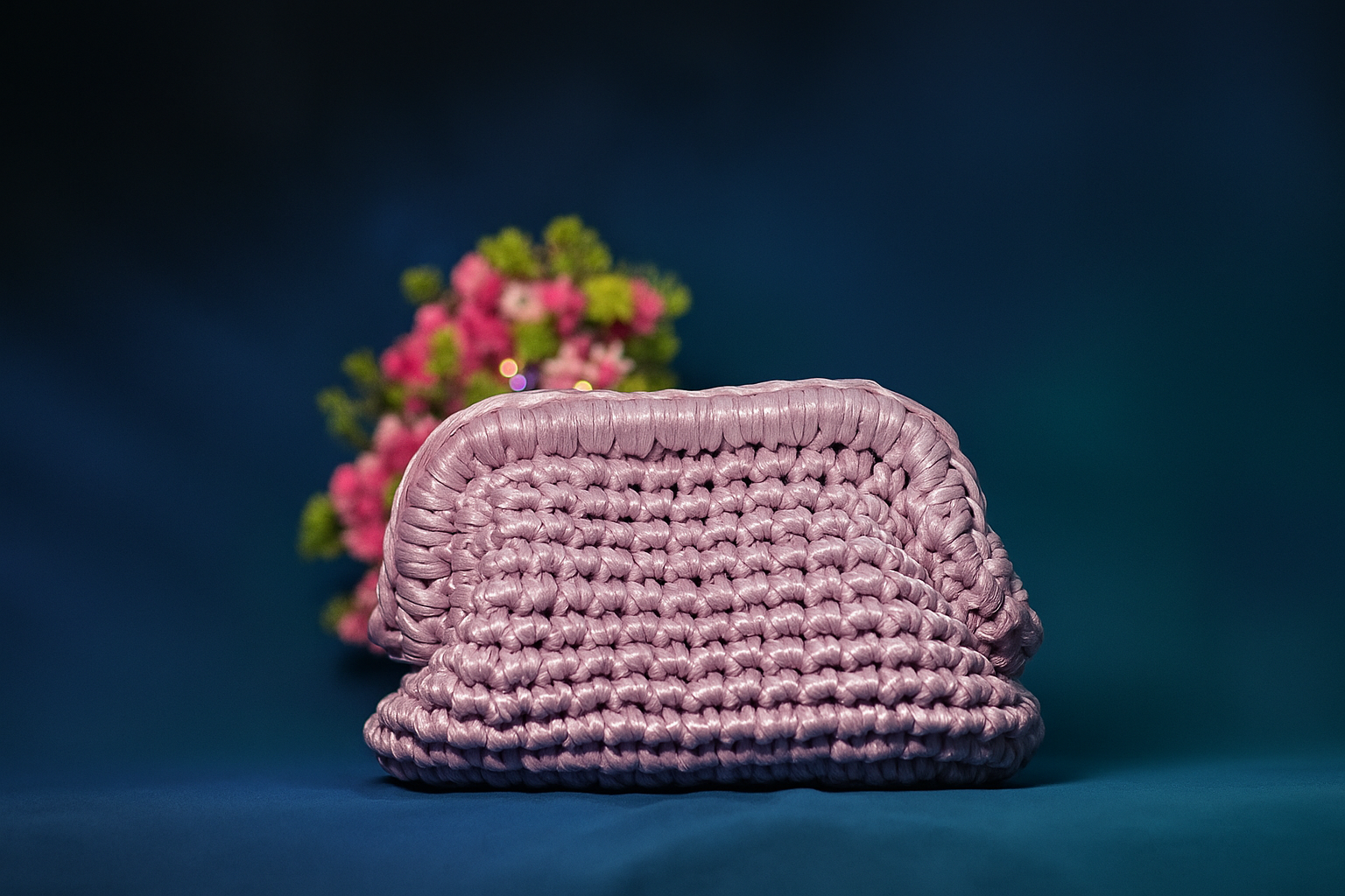 A handcrafted bronze metallic crochet clutch featuring a glossy woven texture and a softly curved silhouette. Its rich shine and structured design make it a perfect statement accessory for parties, weddings, and festive occasions.