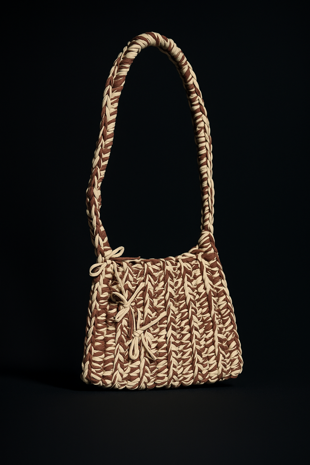 A stylish handcrafted baguette shoulder bag featuring a beautiful blend of brown and yellow T-shirt yarn. Designed with a long braided strap, textured woven body, and decorative front ties, this lightweight bag adds a warm, earthy charm to any casual look.