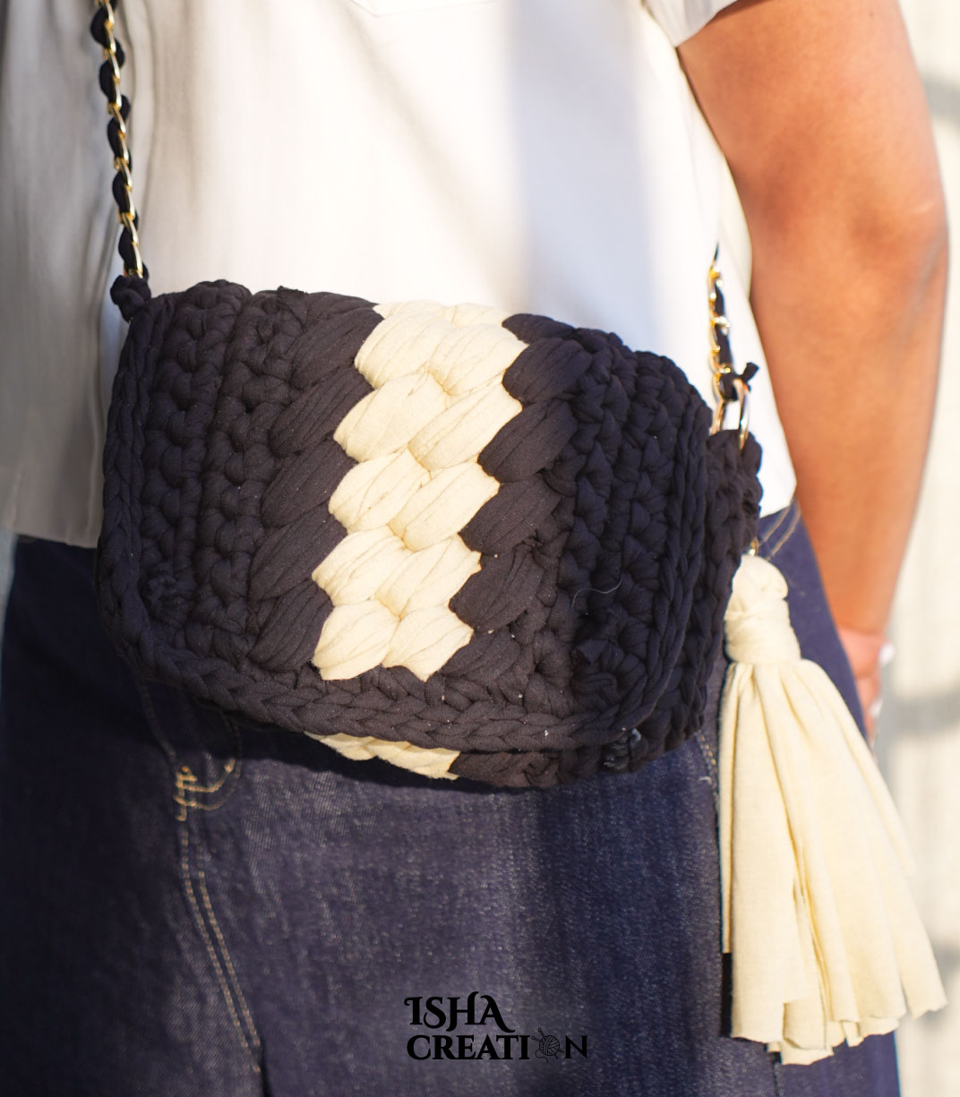 This stylish handmade crochet sling bag is crafted with premium t-shirt yarn in a chunky woven pattern that gives it a modern and unique look. The compact cylindrical shape makes it perfect for carrying everyday essentials like your phone, wallet, keys, and small accessories.