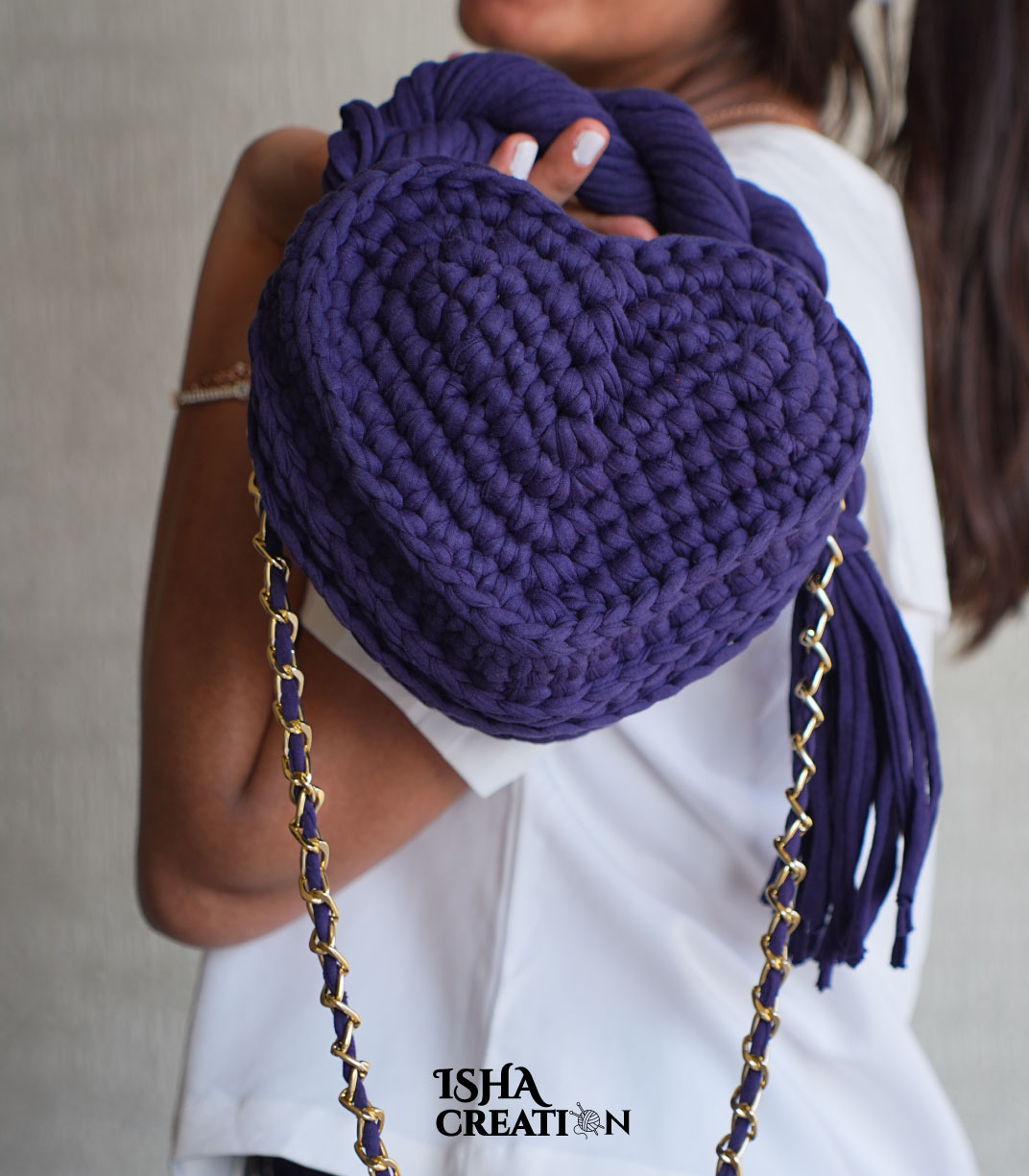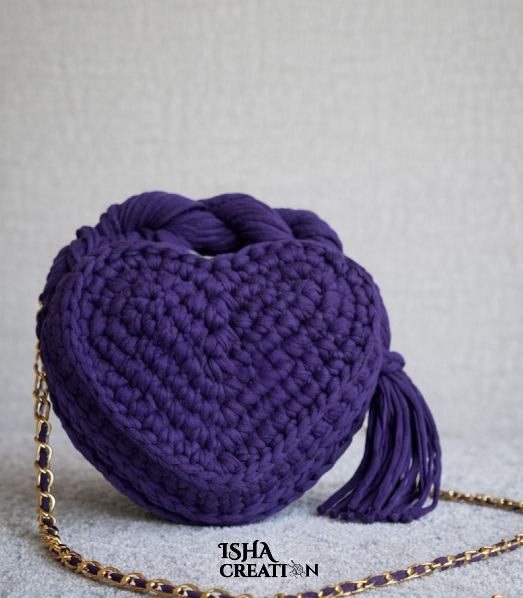 This beautifully handcrafted crochet handbag is designed in a unique heart shape that adds a playful and stylish touch to any outfit. Made with premium t-shirt yarn using a chunky crochet technique, the bag is soft, durable, and lightweight.
