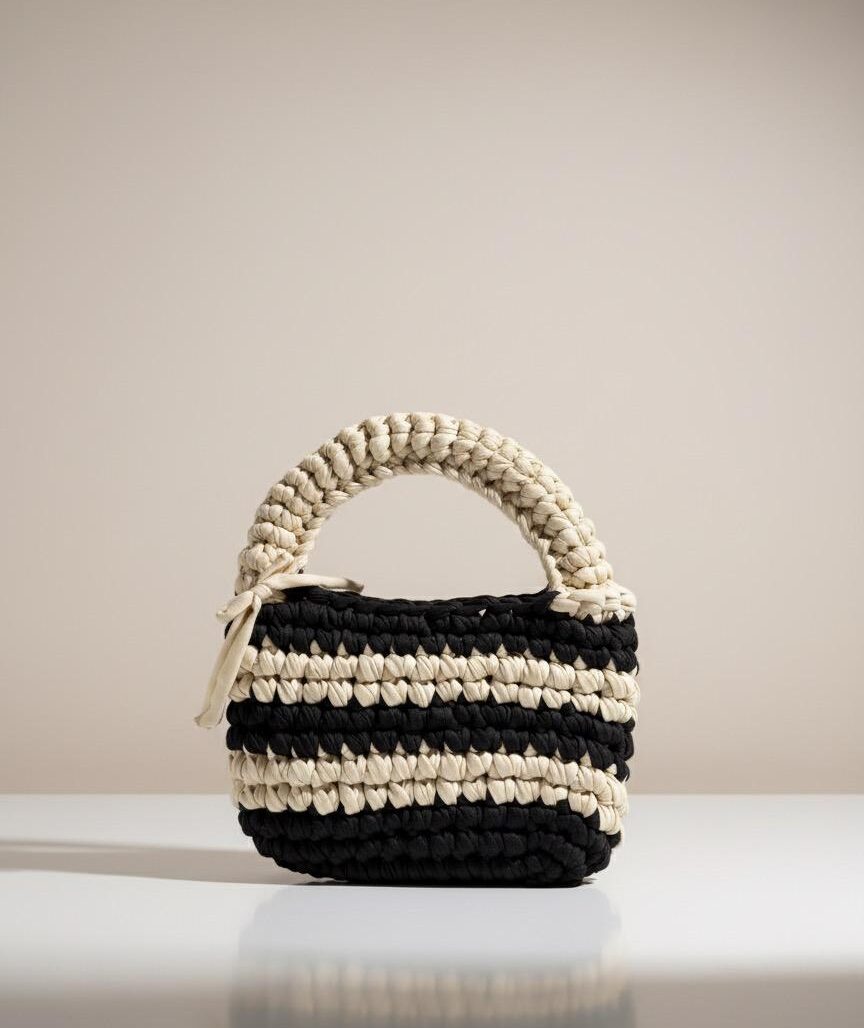 A timeless mini top-handle bag handcrafted in classic black and cream stripes. Designed with a soft yet structured woven finish, this piece offers effortless elegance and everyday versatility. Compact and lightweight, it’s perfect for carrying your essentials while complementing both casual and elevated looks.